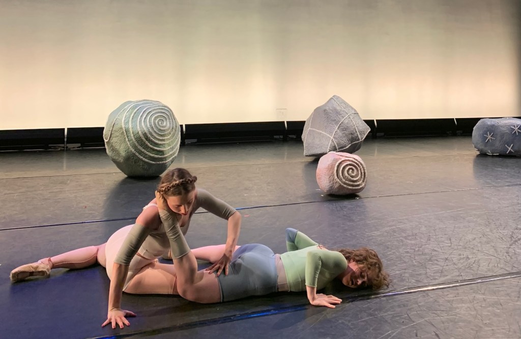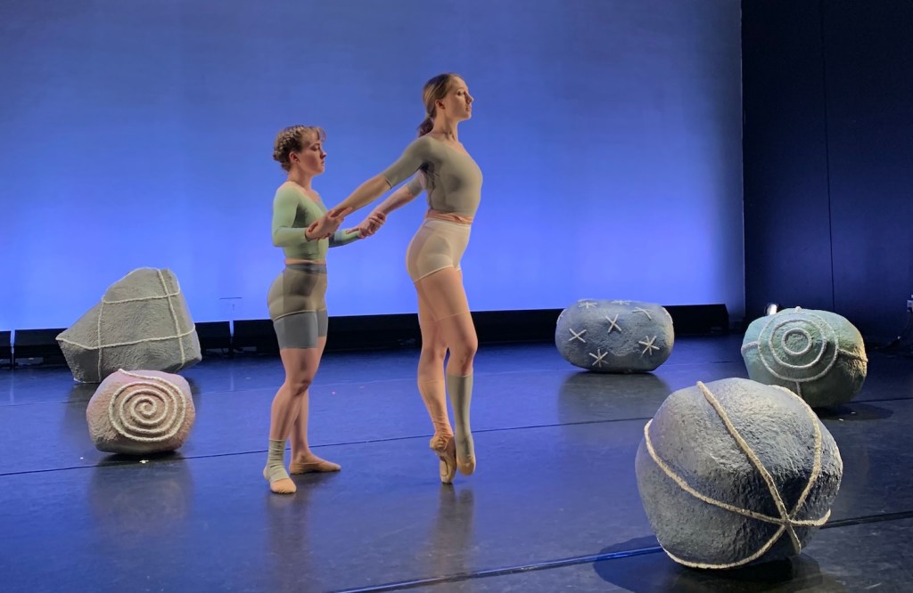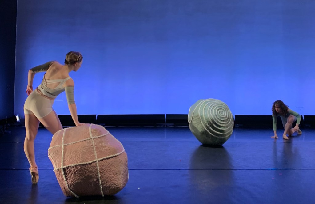 Terra (2024) a collaboration between choreographer Chloe Sonnet Brown and Cadence Giersbach, commissioned by Norte Maar for CounterPointe 11: New work by women choreographers and their collaborations with artists. Presented March 1 – 3, 2024 at the Mark O’Donnell Theater in Brooklyn. A duet by Arimee Gambill and Olivia Passarelli featured seven sculptures of various sizes, Acrylic on sculptamold, cardboard, and plastic.